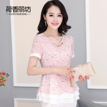 荷香丽坊碎花短袖雪纺衫女装夏季2017新款小衫大码遮肚子显瘦上衣