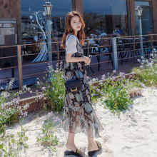 假两件套碎花雪纺吊带连衣裙女韩版短袖波西米亚海边度假沙滩长裙