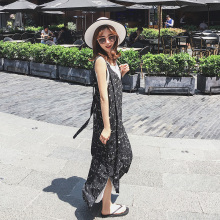 长裙女夏装2017新款韩版显瘦黑色雪纺碎花吊带连衣裙两件套星星裙