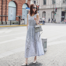 2017夏季新款棉麻星星印花无袖条纹连衣裙女韩版学生收腰显瘦长裙