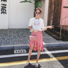 短袖T恤红色格子半身裙两件套套装女韩版学生不规则中长款连衣裙