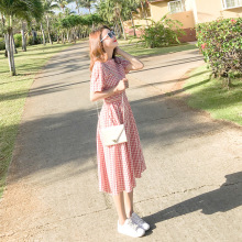 2017夏季小清新文艺范格子连衣裙女中长款韩版修身收腰学生学院风
