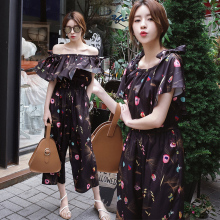 连体衣女装2017夏季新款韩版九分高腰一字肩领碎花雪纺阔腿连体裤