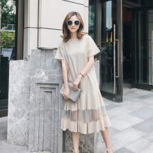 焦糖色网纱拼接T恤连衣裙女中长款2017夏新款韩版学生宽松鱼尾裙