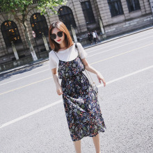 韩版小清新碎花雪纺假两件套吊带连衣裙女中长款短袖收腰修身显瘦