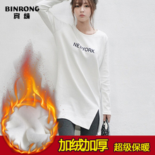 加绒加厚打底衫中长款字母印花长袖圆领冬季包臀修身T恤韩版女士