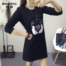 2016韩版秋冬新款加绒加厚长袖裙子宽松中长款印花卫衣连衣裙女士