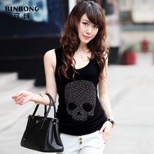 2016夏季韩版时尚新款修身显瘦骷髅头烫钻网纱工字吊带背心女士潮