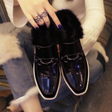 2017新款英伦风女鞋冬厚底隐形内增高坡跟加绒毛毛鞋女方头鞋单鞋