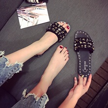 2017新款女鞋韩版百搭鞋子铆钉罗马鞋时尚凉鞋女潮一字绑带平底鞋