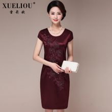 雪莉欧中年重磅真丝连衣裙桑蚕丝绸缎中长款2017夏高档妈妈婚礼装