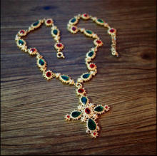 包邮 韩国新款欧美巴洛克中世纪情十字架彩色宝石毛衣链项链衣链
