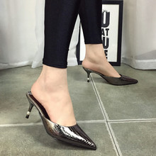 2017春夏新款欧美尖头高跟拖鞋蛇纹浅口包头细跟凉拖鞋女中跟外穿