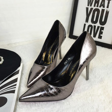 2017春秋新款欧美尖头细跟浅口高跟鞋枪色性感职场OL工作女单鞋