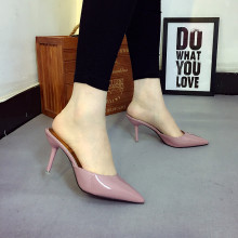 2017夏季新品漆皮尖头细跟凉拖鞋女浅口性感包头高跟拖鞋简约半拖