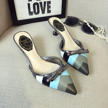 2017夏季新款韩版蝴蝶结尖头细跟拖鞋浅口真皮中跟包头凉拖鞋子女