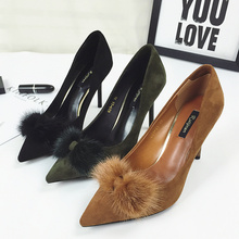 尖头高跟鞋女秋2016新款冬韩版貂毛细跟黑色高跟鞋加绒性感单鞋潮