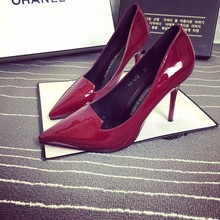 2017春季新款欧美漆皮酒红色浅口尖头高跟鞋黑色细跟单鞋浅口女鞋