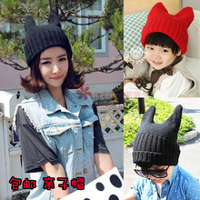 包邮韩版春秋冬新款男女童双角帽儿童恶魔牛角帽宝宝毛线帽亲子帽