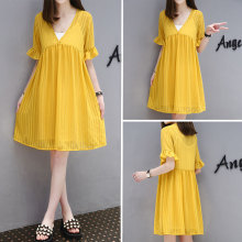 孕妇装夏装韩版宽松蕾丝花边连衣裙中长款时尚高腰雪纺短袖孕妇裙