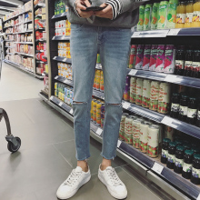 17春夏新款质感水洗破洞哈伦裤小脚九分牛仔裤