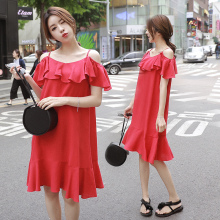 夏季红色V领荷叶边短袖露肩雪纺吊带连衣裙女中长款韩版宽松显瘦