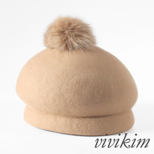 高档狐狸毛球贝雷帽纯羊毛呢女士蓓蕾帽保暖毯帽礼帽英伦复古礼帽