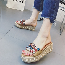 2017新款水钻一字拖鞋女夏韩版防水台松糕底时尚外穿坡跟凉拖厚底