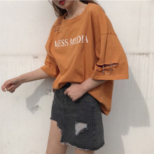 韩国原宿风bf夏季女装韩版宽松百搭大别针中长款破洞T恤女短袖潮
