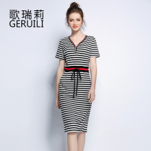 歌瑞莉胖妹妹夏装长裙2017新款加肥加大码女装胖mm条纹休闲连衣裙