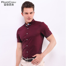 雷德西奥酒红色修身男士短袖衬衫商务纯色休闲衬衣