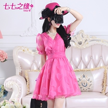 七七之缘2016夏季新款女装韩版 玫红色爱心绣花欧根纱修身连衣裙