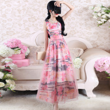 2016夏季新款女装韩版 粉色时尚印花修身显瘦网纱背心长裙连衣裙