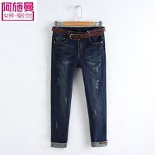 女裤秋款2016新款 高腰修身显瘦大码翻边牛仔裤女长裤小脚裤82012