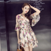 春夏季新款女装时尚性感甜美V领印花喇叭袖修身雪纺连衣裙短裙潮