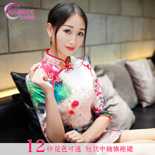 旗袍短款2016新款春夏装短袖修身改良连衣裙时尚丝绸印花日常复古