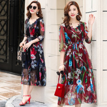 雪纺连衣裙女夏季新款波西米亚印花长裙修身中袖V领碎花裙沙滩裙