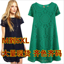 夏季大码2015 欧美新款连衣裙宽松短袖镂空蕾丝A字打底裙
