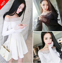 yy网络直播上镜服装 甜美可爱一字领露肩喇叭袖露肩蕾丝上衣潮