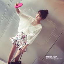 夏装新品韩版V领拼接蕾丝蝙蝠雪纺衫防晒衣+吊带+短裙三件套女