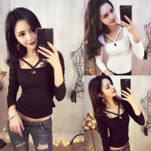 2016秋冬季新款T恤女装修身打底衫夜店性感低胸镂空交叉长袖上衣