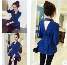 2016秋款新装韩版镂空修身衬衣七分袖双排扣性感收腰牛仔外套女潮