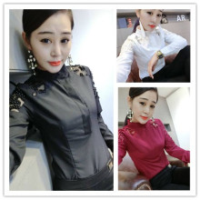 欧洲站2016秋季手工缝珠钩花镂空性感气质修身显瘦打底衫衬衫女