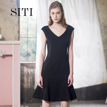 Siti Selected无袖黑色性感连衣裙夏季修身V领鱼尾裙简约小黑裙女