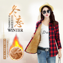 冬装新款韩版修身女士加绒衬衫 纯棉加厚格子保暖衬衣 大码