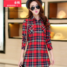 2017新款包邮女装格子长袖衬衫春装纯棉修身中长款女衬衣外套