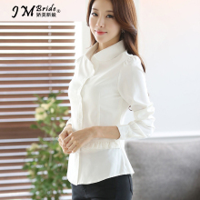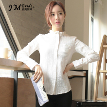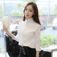 白衬衫女长袖韩范职业装修身显瘦百搭立领木耳边花边纯棉衬衣上衣
