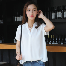 白色雪纺衬衫女短袖夏季新款韩范套头V领宽松休闲打底衬衣微透