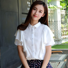 雪纺白衬衫女长袖2017夏短袖荷叶边上衣打底衫韩范学院立领衬衣女