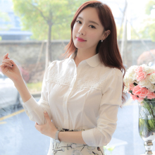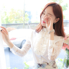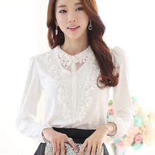 女士蕾丝打底衫白衬衫女长袖雪纺学生韩范学院风花边立领衬衣修身